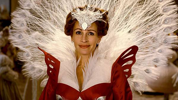 我很喜歡這部電影對於童話故事中王國富麗堂皇、壯觀而夢幻的形象實體化,讓每個畫面看起來好美麗,如詩如畫,即使是黑暗森林裡的景色,也經過一番設計,躍然紙上,除此之外,這部電影的服裝設計堪稱一絕,壞皇后一套接著一套的華麗裙裝,目不暇給,像是美豔的孔雀裝,看起來壯觀的白色羽毛裝,一件一件都好像是歌手演唱會般的誇張,是視覺上的享受。電影中我最喜歡動物Party的那一段,宴會中每個賓客的服裝都有所巧思,而且十分逗趣,美麗中參雜著幽默趣味,這段戲令人開心。