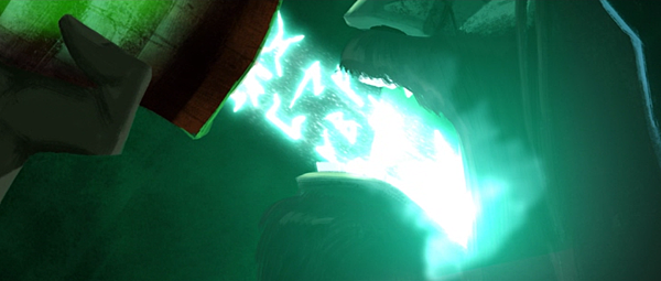 撇開劇情這點不談,這個動畫短片畫得還不賴,一開場透過巨石陣的排列,顯示出短片的片名,很有現代街頭裝置藝術的美感,另外,這個短片除了開頭與結尾女巫的部分是立體繪製外,其他都是用類似油畫的畫風來呈現,一方面貼和女巫說故事一種朦朧模糊的印象感外,另一方面也展示出有別於電影正片的風格,帶給觀眾融合既有蘇格蘭風情以及視覺上有新鮮的體驗。其中我最喜歡一個畫面是當王子拿起女巫配置的魔藥,從瓶子中透過王子的臉映出熊的模樣,很有暗示性也很有視覺美感。